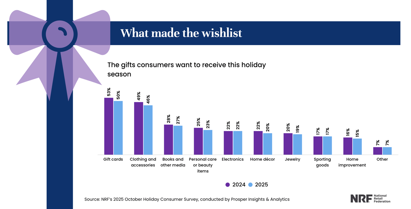 According to the survey, the top gifts consumers would like to receive include gift cards (50%), clothing or accessories (46%), books and other media (27%), personal care or beauty items (23%) and electronics (22%). Jewelry was mentioned by 19%, down slightly from last year’s 20%.