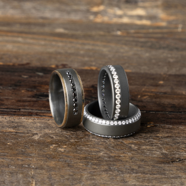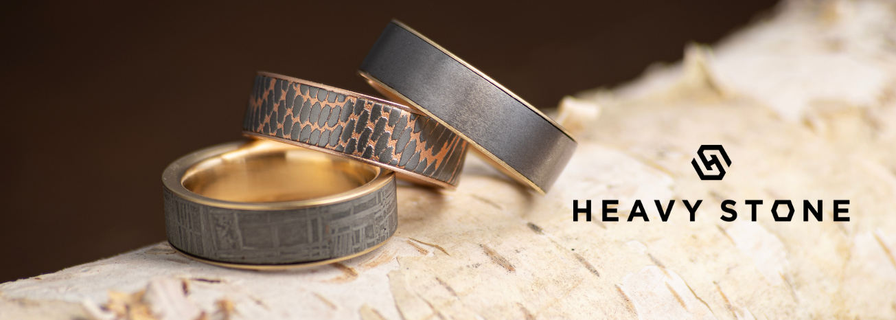 Heavy Stone got its start 22 years ago when one guy, who just so happened to be pretty good with machines, helped his sister make a tungsten wedding band for her groom. In fact, the word “tungsten” is Swedish for “heavy stone.” Today Heavy Stone continues a tradition of superior modern metal wedding band manufacturing but also offers a broad selection of precious metal designs too.