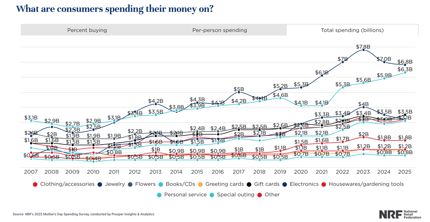 “Mother’s Day is an important holiday for many consumers, only surpassed by the winter holidays in terms of average spending,” NRF Vice President of Industry and Consumer Insights Katherine Cullen said. “Even in the face of economic uncertainty, consumers continue to celebrate the special women in their lives with gifts and outings.”