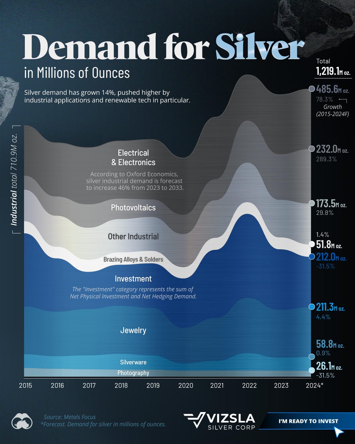 The silver market is forecast to record another significant deficit (total supply less demand) for the fifth consecutive year in 2025. In keeping with previous years, silver industrial demand will remain the key driver of this favorable supply/demand backdrop, with volumes projected to hit a new record high this year.
