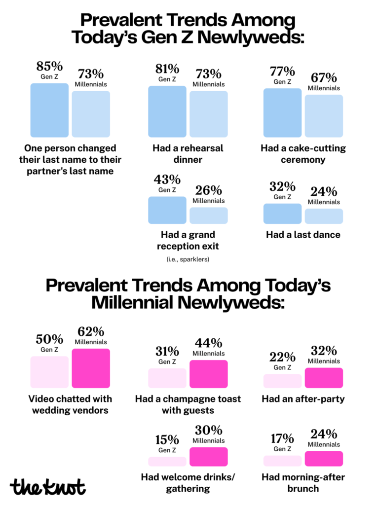It’s safe to say Gen Z and millennials both love to celebrate, but their party styles are different. According to the wedding statistics 2024 couples gave us, roughly one in three newlyweds were Gen Z. Given their younger marrying age (18-27), we see that many embrace more traditional elements which may be a factor of their background and family influence.