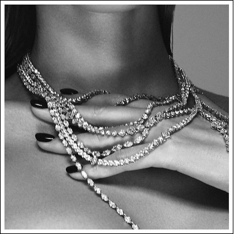 Meanwhile, purposeful color choices like gold, white, blue, and silver can speak holiday-suggestive volumes of their own. For example, when H.K. Designs features hefty link bracelets and pendant necklaces on white backgrounds in their social media posts, the gleam of their yellow gold and white diamonds suggests holiday joy without any other symbols or props present.