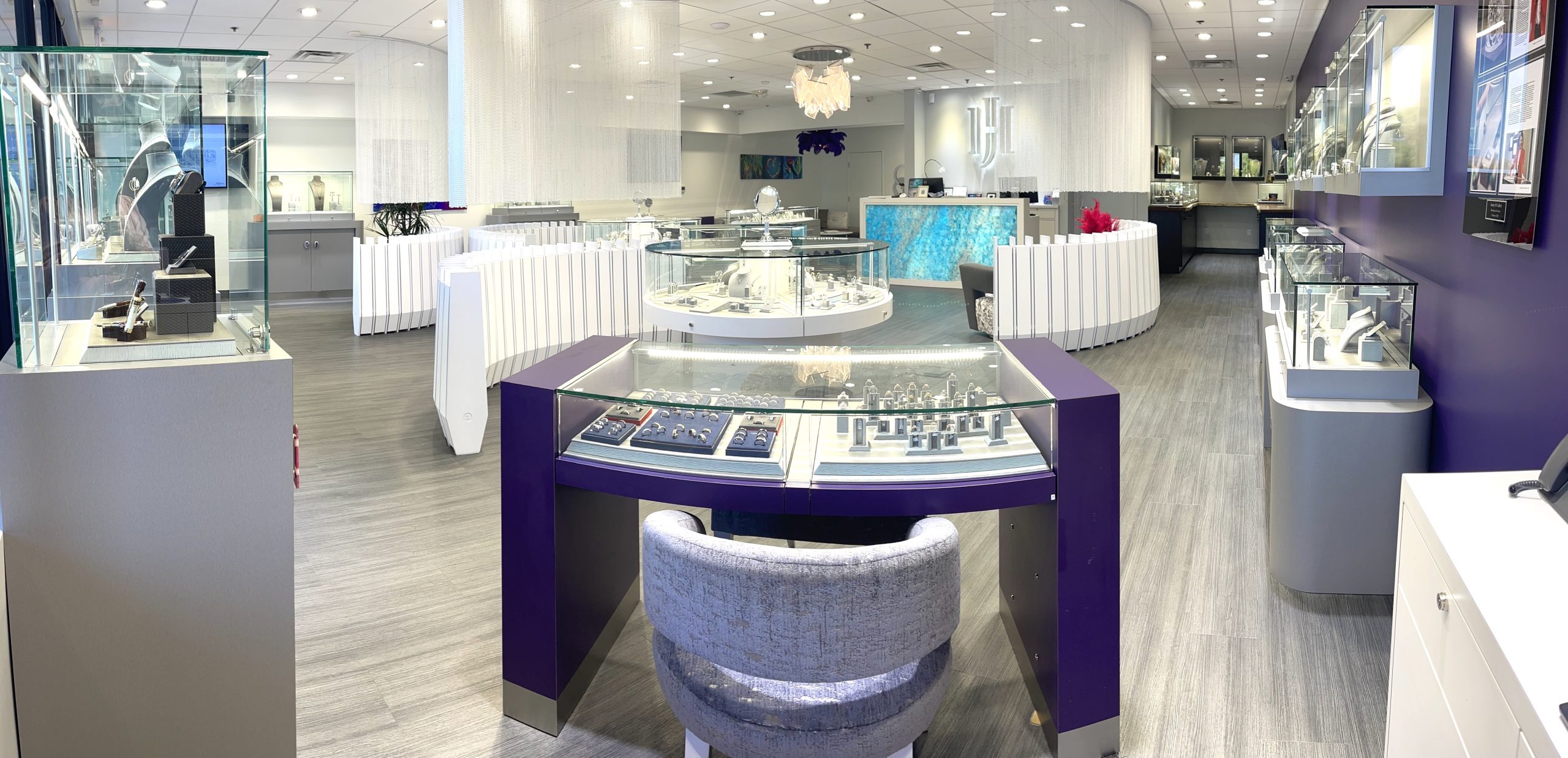 The use of side-by-side jewelry cases can create trust within your customers, which can lead to more sales. See picture of Huntington Jewelers in Las Vegas, NV of the side-by-side jewelry cases that provide the advantage of increased openness because the buyer and seller stand close to each other. Leslie McGwire & Associates Interior Design Company designed the new store Huntington Jewelers of with many side-by-side jewelry cases from “Concept to Completion.”
