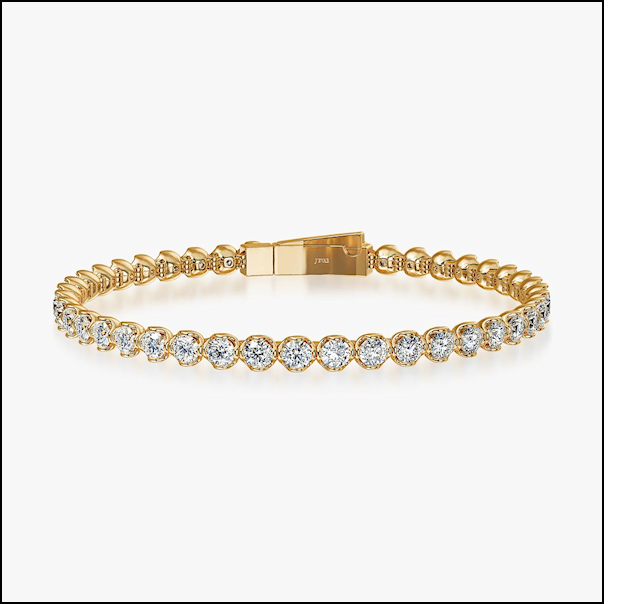 For sure, labs rule when it comes to innovation and more bang for your buck in the bridal arena. In the commitment ring category, oval and elongated lab-grown diamond centers are moving well “thanks to Ms. Swift,” notes Shah. The bulk of his lab-grown diamond sales are in bands, followed by engagement rings, then diamond bracelets and tennis necklaces.