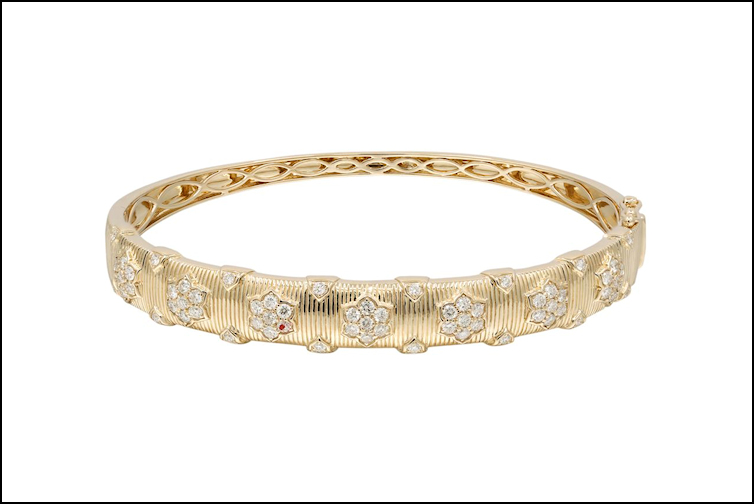 For sure, labs rule when it comes to innovation and more bang for your buck in the bridal arena. In the commitment ring category, oval and elongated lab-grown diamond centers are moving well “thanks to Ms. Swift,” notes Shah. The bulk of his lab-grown diamond sales are in bands, followed by engagement rings, then diamond bracelets and tennis necklaces.