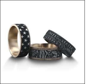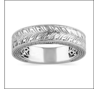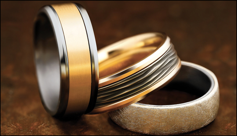 For the upcoming JCK Las Vegas fair, Benchmark will unveil new looks for gents featuring texturing and new metal combinations. “Alternative materials are certainly very important in today’s marketplace, given the cost of precious metal,” he adds. Also at the show, seek out Benchmark’s new American-theme bands in its Brook & Branch line and a fresh quintet of patterned looks in its Ammara Stone collection.