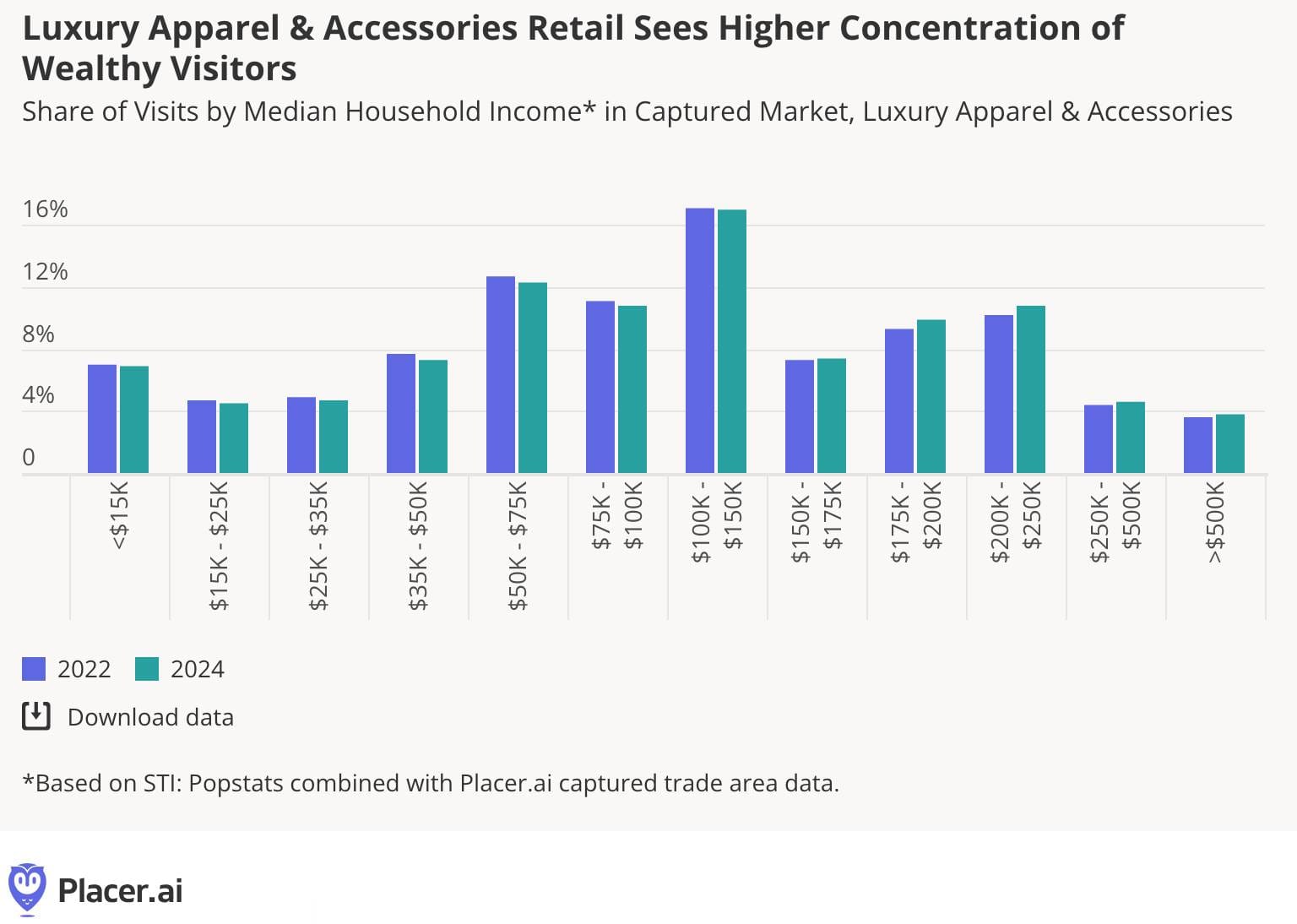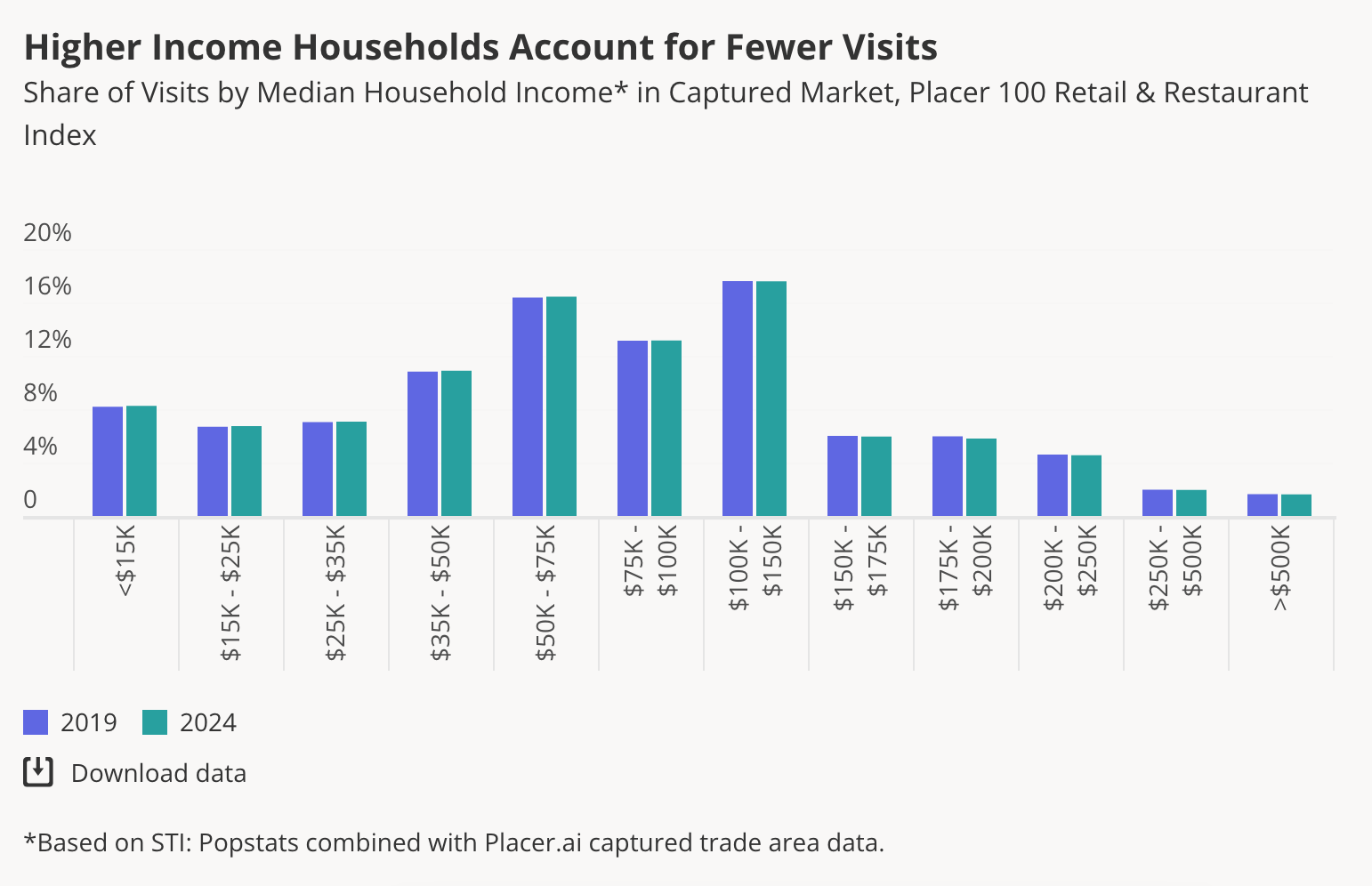 What’s fascinating, though, is that despite the buying power of high income consumers – they aren’t large contributors of retail visitation overall. According to our Placer 100 Dining and Retail Index, households with income greater than $200K accounted for 8.1% of overall visits in 2024, which is slightly lower than the share of visits from the same group in 2019 (8.2%). The share of visits from lower income households increased since the pandemic (32.9% of visits from households with a median income of $50K or less in 2024, compared to 32.7% in 2019), while the inverse is true for higher income shoppers.